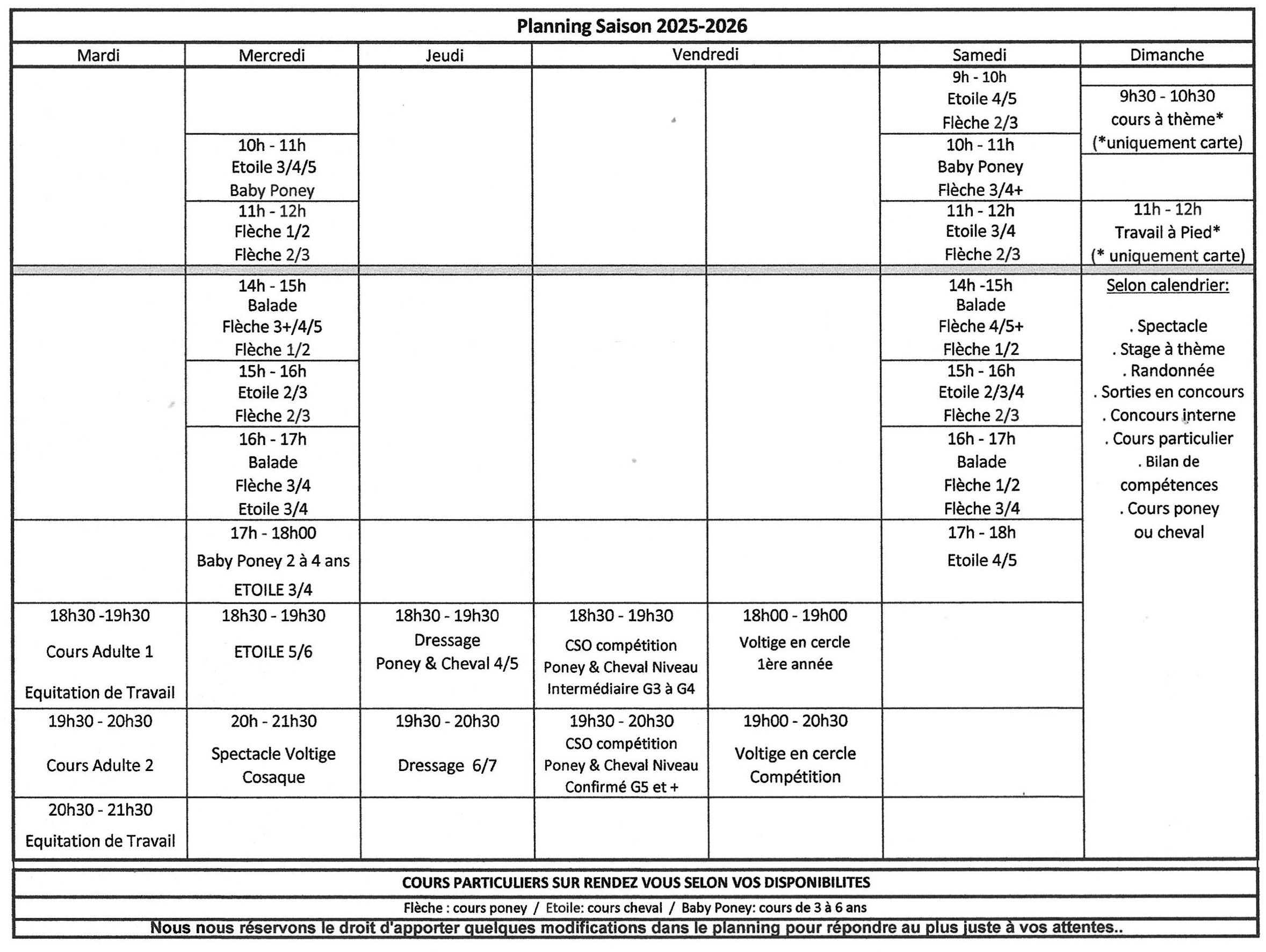 Les cours ne seront pas dispensés lors des vacances scolaires: des stages à la journée ou 1/2 journée, des cours particuliers ainsi que des soirées équestres à thème vous seront proposés.