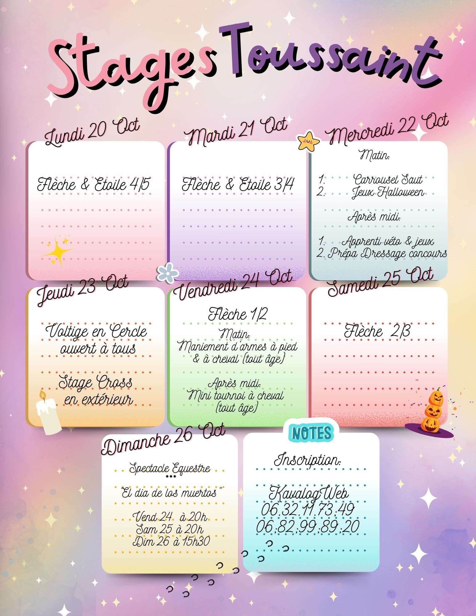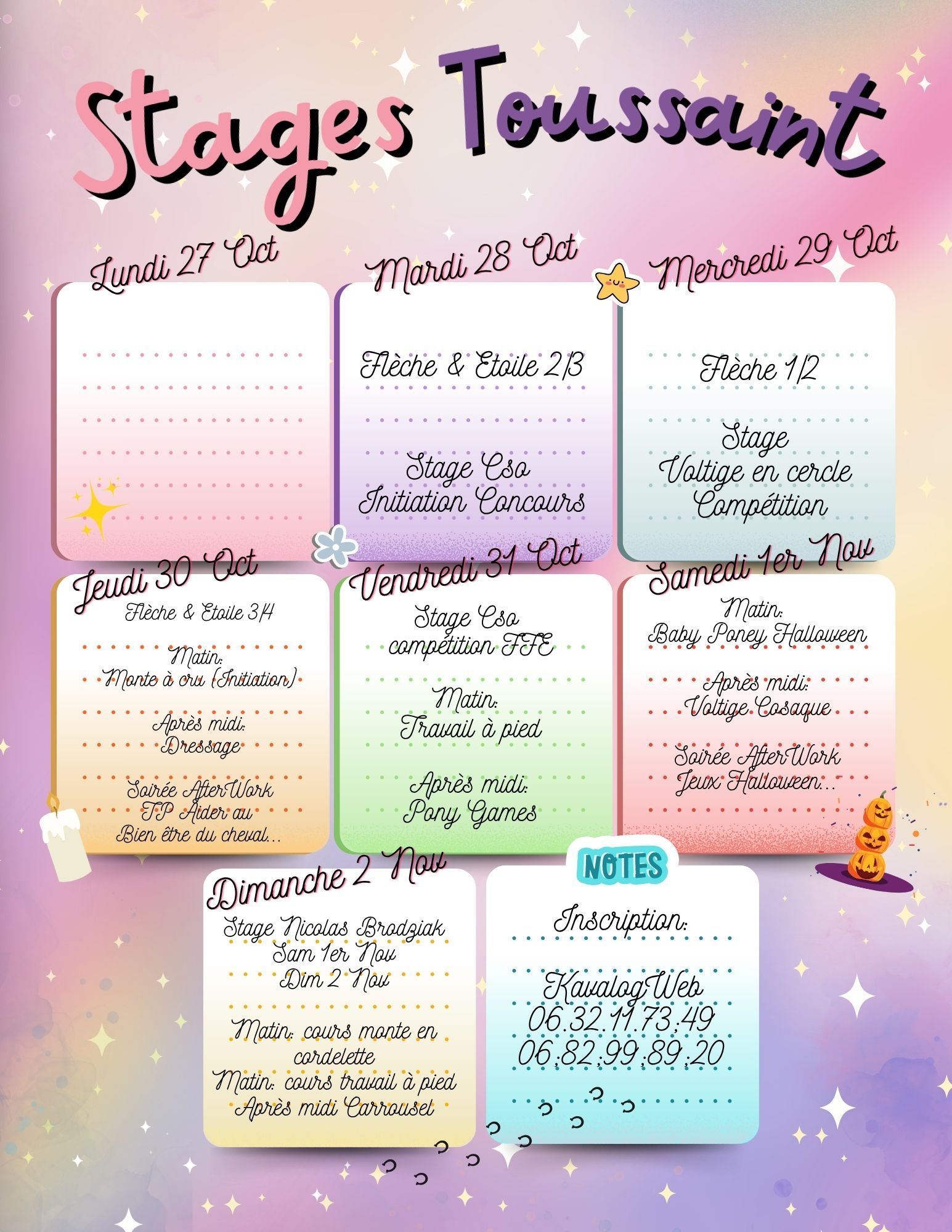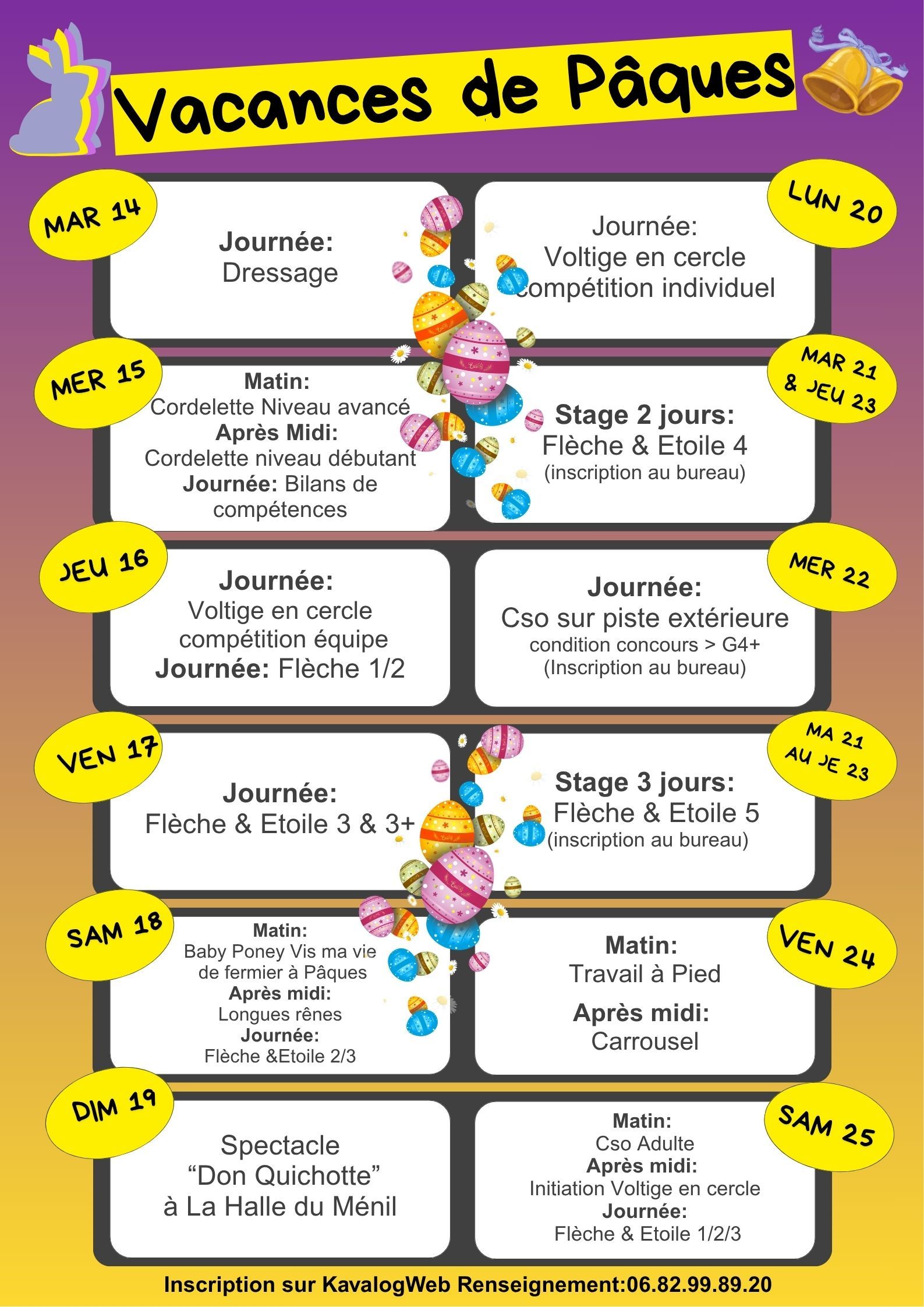 Les cours ne seront pas dispensés lors des vacances scolaires: des stages à la journée ou 1/2 journée, des cours particuliers ainsi que des soirées équestres à thème vous seront proposés.